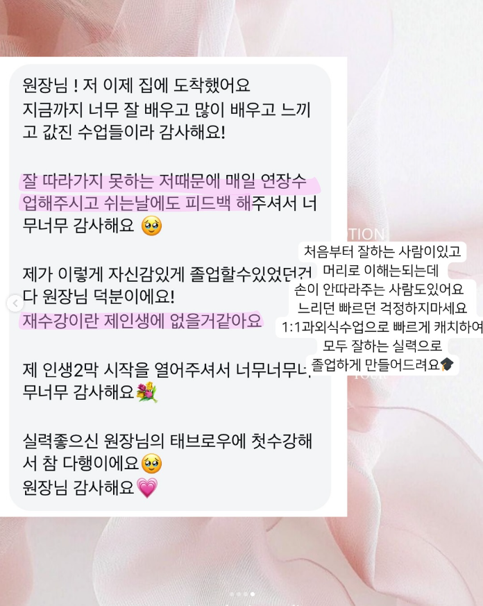 수강이 끝난 지금도 꾸준히 피드백해주시고 지원해주시는 원장님 보면서 정말 감사하고 또 감사해요🥹🥹🥹